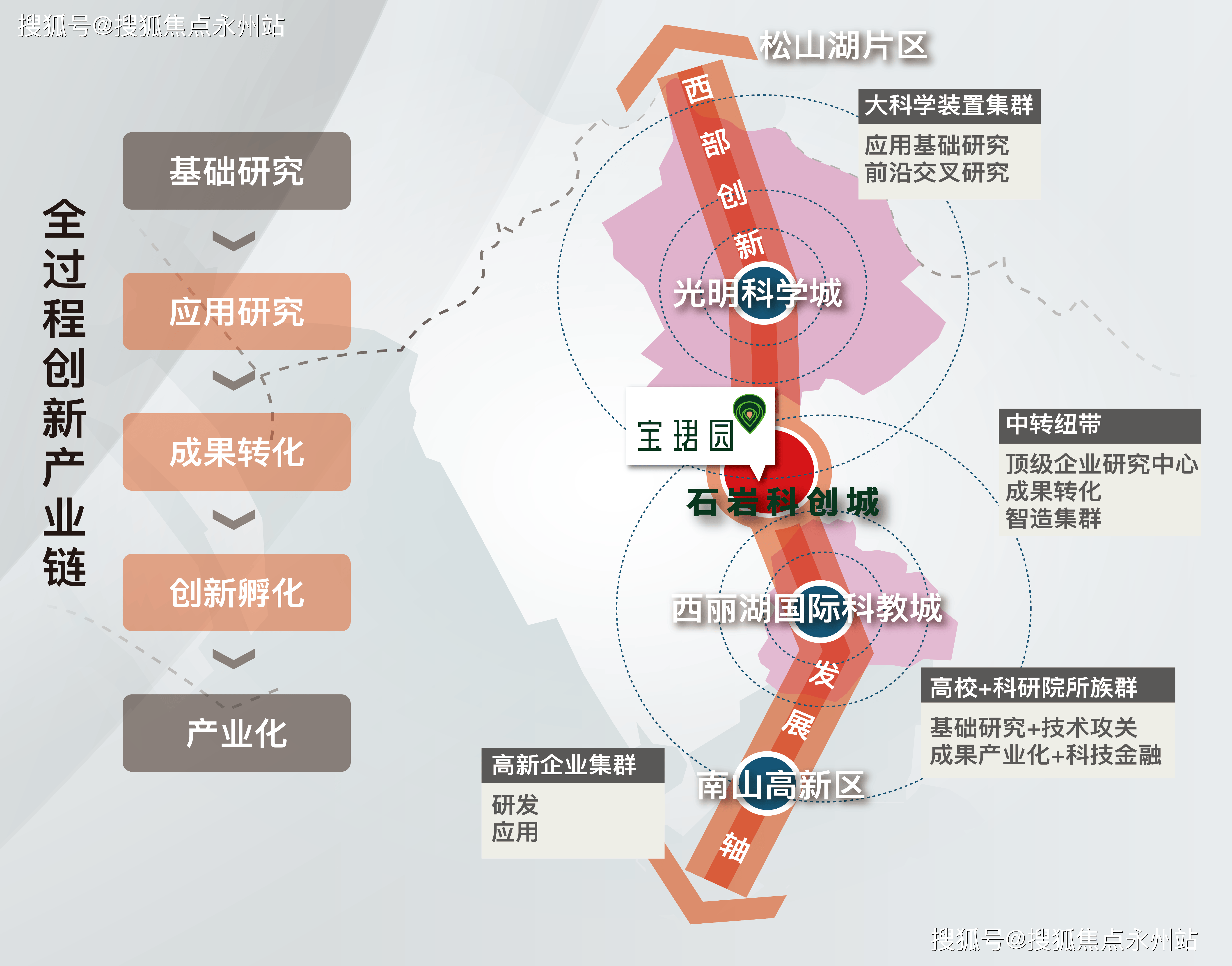 科技中轴贯穿南山科技园、西丽国际科教城、宝安科创城、光明科学城科创城位于科技中轴关键节点,定位科技产业成果转化的承载区域宝珺园择址科创城,坐踞科技中轴枢纽勇力时代潮头,未来价值凸显