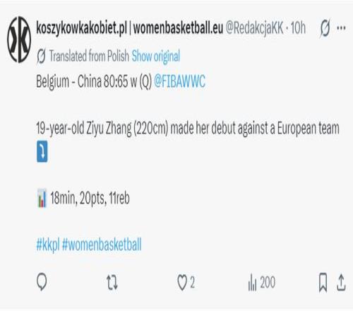 外媒写道:比利时女篮击败了前世界杯亚军中国队,虽然中国队的新星张子宇不答应打出不俗状态。