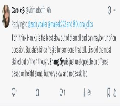 美球迷:韩旭是中国队内线中速度最快的,但她的身体对抗不行;李月汝是四大中锋中技术最全面的,张子宇就凭身高优势在内线就不可阻挡,但他速度很慢,技术也不如其余三人还需要提升。