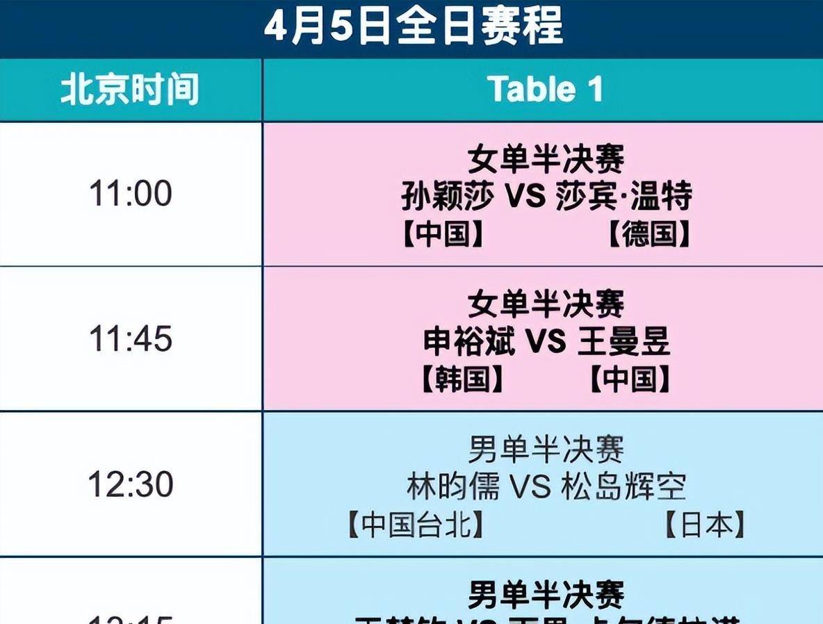今天的比赛分为两个时段进行。 上午11点,半决赛的战幕将准时拉开。 首先登场的是世界排名第一的孙颖莎,她的对手是来自德国的莎宾·温特。 紧接着在11点45分,王曼昱将出战,对阵韩国名将申裕斌。 午间12点30分,男单半决赛开始,由中国台北的林昀儒迎战日本的松岛辉空。 最后一场半决赛在下午1点15分进行,由王楚钦对阵巴西的雨果·卡尔德拉诺。 经过短暂的休整,冠军争夺战将在晚间黄金时间打响。 女单决赛定于晚上7点30分,男单决赛则在8点15分上演。 央视CCTV5将对这两个时段的所有比赛进行全程直播,央视频、咪咕视频等平台也会同步转播。