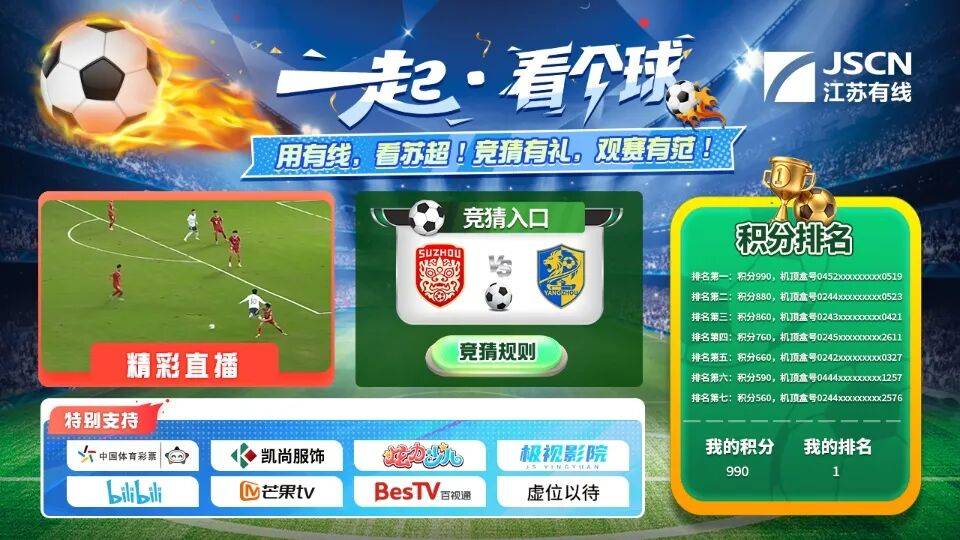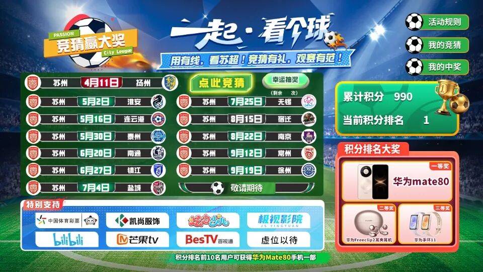 参与江苏有线(电视端)线上竞猜赢取积分,有机会获得华为手机、耳机、手环等丰厚奖品。详见江苏有线(电视端)“一起·看个球”竞猜活动规则。