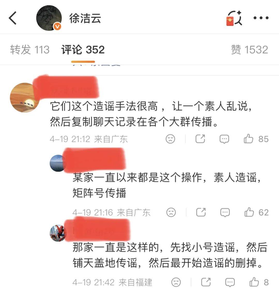 还有人在徐洁云评论区表示:它们这个造谣手法很高 ,让一个素人乱说,然后复制聊天记录在各个大群传播。