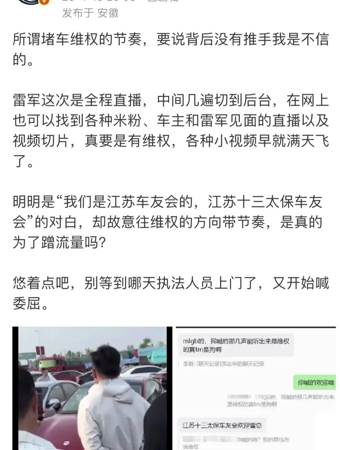 还有博主表示:所谓堵车维权的节奏,要说背后没有推手我是不信的。雷军这次是全程直播,中间几遍切到后台,在网上也可以找到各种米粉、车主和雷军见面的直播以及视频切片,真要是有维权,各种小视频早就满天飞了。