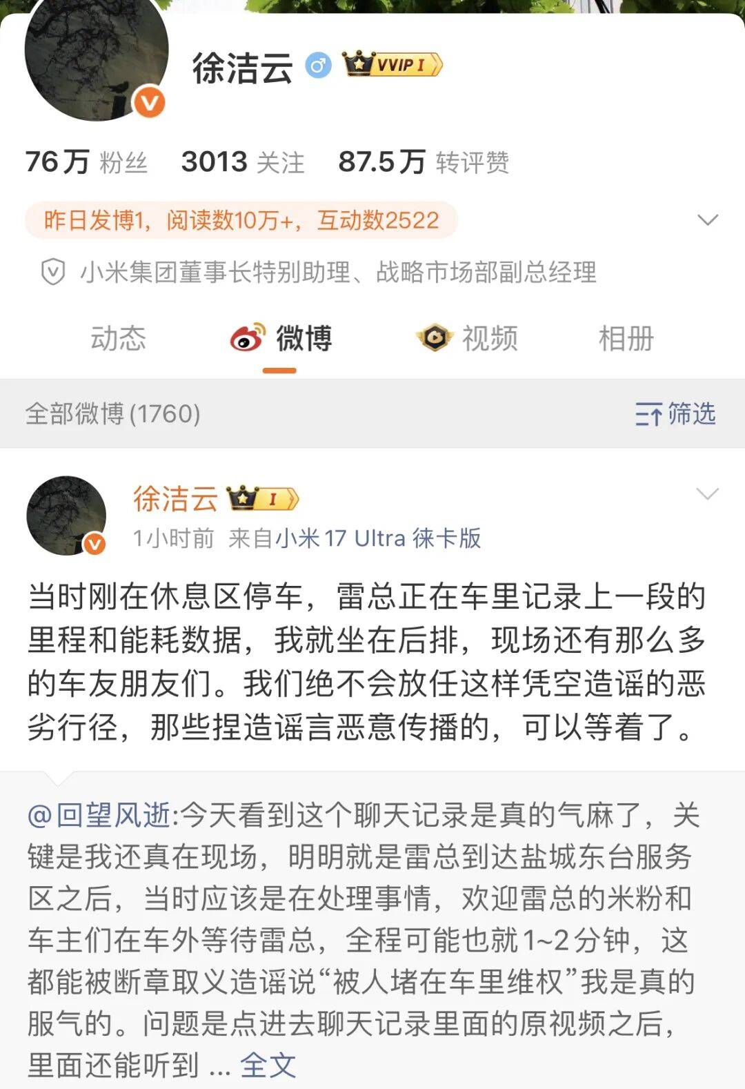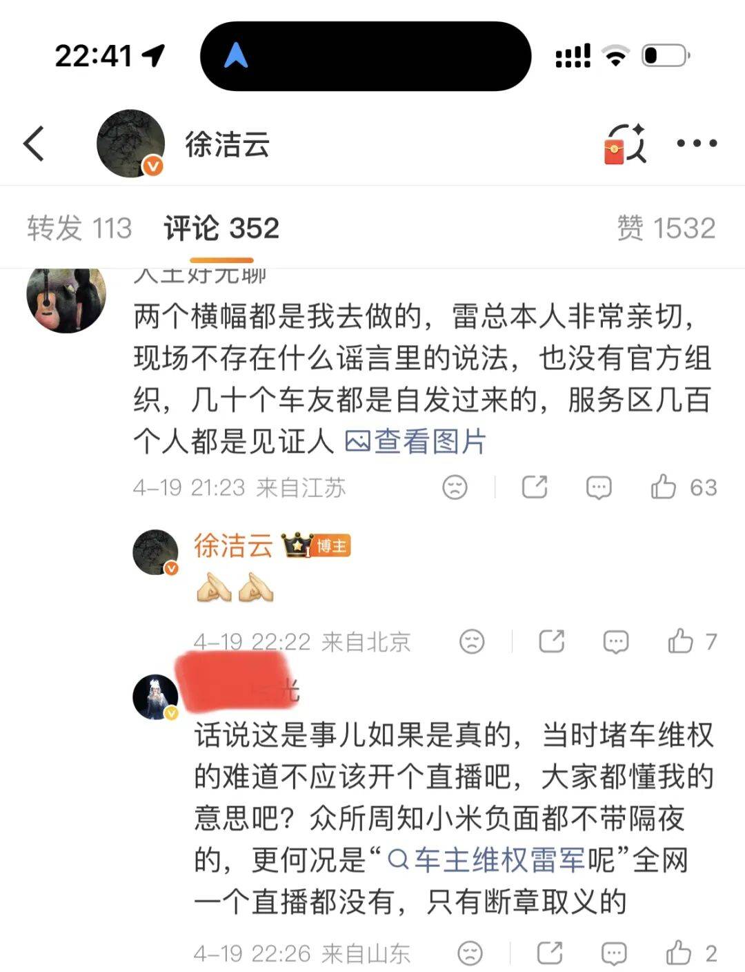 在徐洁云评论区,有车主表示:两个横幅都是我去做的,雷总本人非常亲切,现场不存在什么谣言里的说法,也没有官方组织,几十个车友都是自发过来的,服务区几百个人都是见证人。