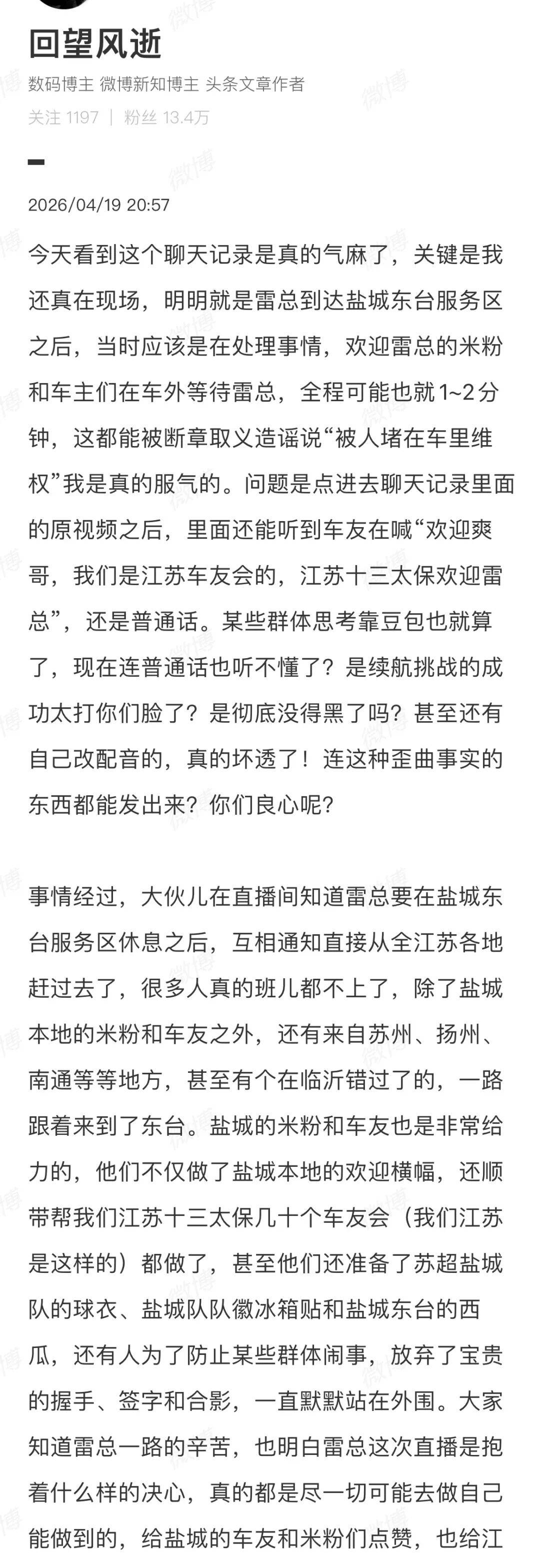 也有在现场的车主作出说明表示:雷总到达盐城东台服务区之后,当时应该是在处理事情,欢迎雷总的米粉和车主们在车外等待雷总,全程可能也就1~2分钟,这都能被断章取义造谣说「被人堵在车里维权」我是真的服气的。